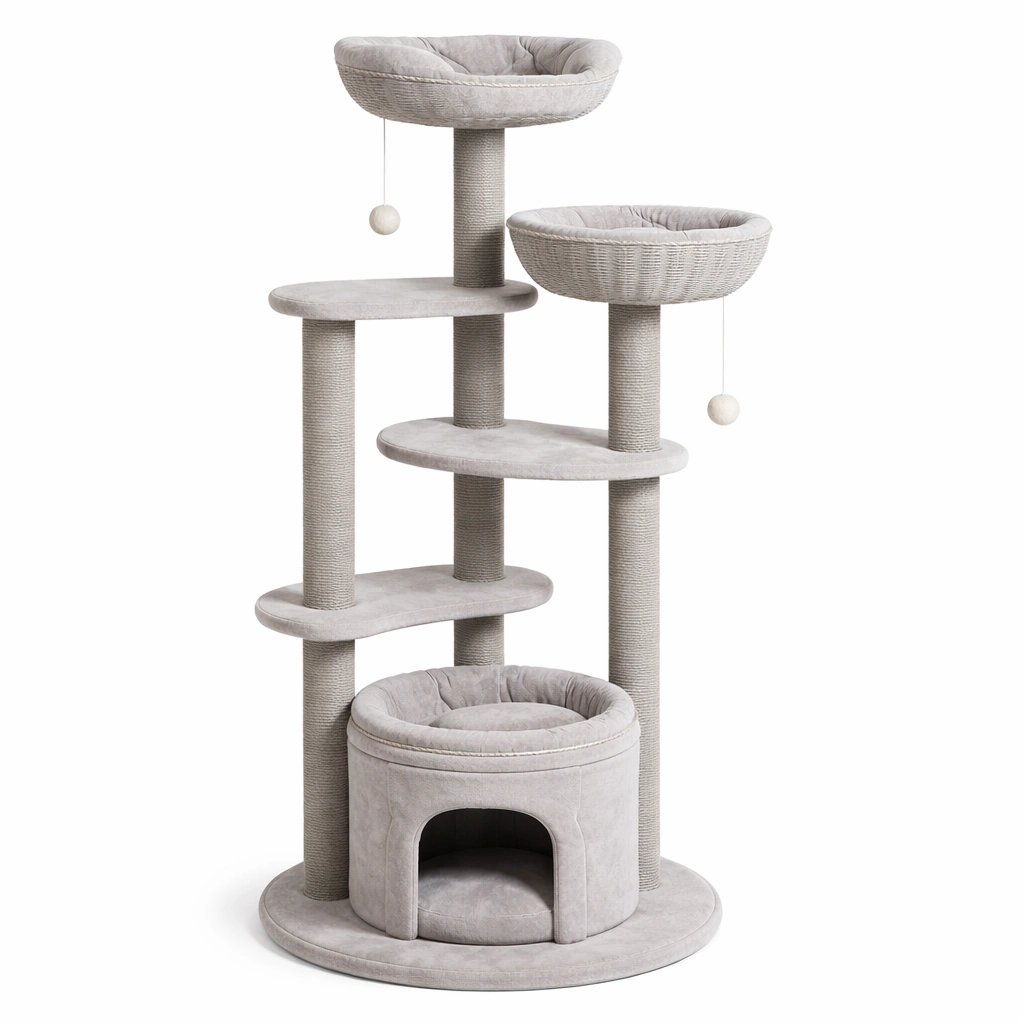 Kratzbaum Holz Sisal Grau mit Höhle und Plattformen 60x40x150 cm