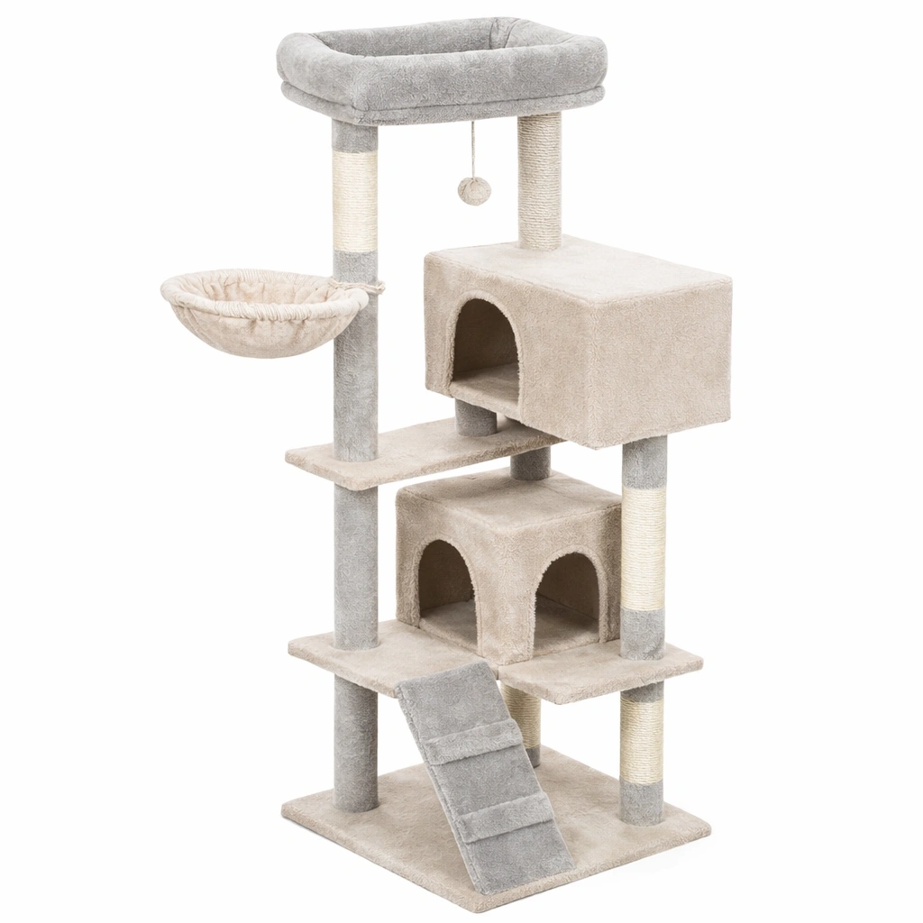 Die Konstruktion umfasst eine Hängematte, eine Leiter und eine Aussichtsplattform sowie zwei Höhlen mit gebogenen Eingängen, die zahlreiche Spiel- und Schlafmöglichkeiten für Katzen bieten. Eine integrierte Spielzeugkugel sorgt für zusätzlichen Spaß.