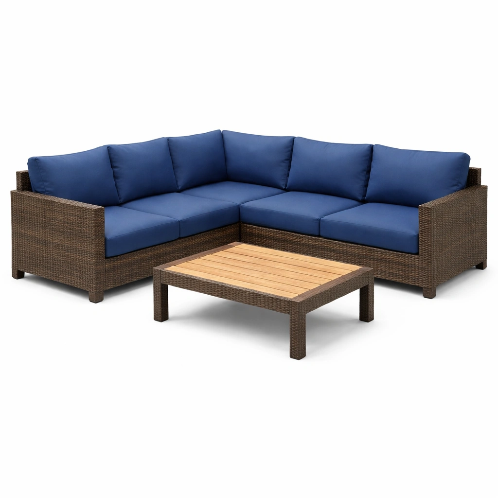 Material: Gestell aus Polyrattan und Aluminium, Tischplatte aus Teakholz